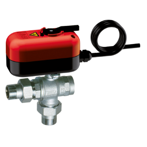 La valvola è dotata di attacchi maschio ed è completa di codoli, calotte e servocomando elettrico a 3 punti. Il servocomando, basato su un motoriduttore, consente la regolazione automatica della miscelazione dell’acqua, ricevendo il segnale da un termostato ambiente modulante o da una centralina climatica.