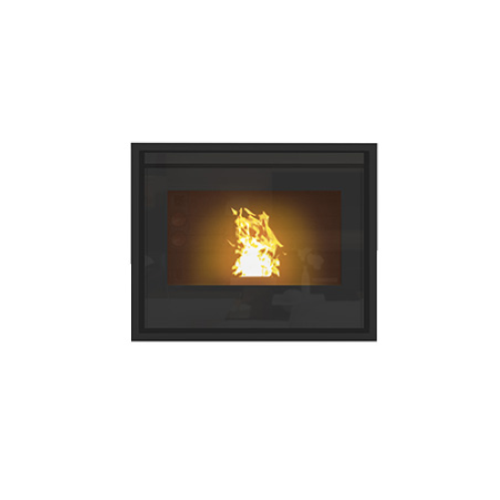 nserto a pellet canalizzabile attraverso due uscite superiori, capacità serbatoio 12 kg, termostato di sicurezza, telecomando, pannello digitale LCD, crono settimanale con tre programmazioni giornaliere indipendenti e di facile utilizzo, guide a scorrimento a totale apertura, pressostato meccanico di sicurezza, porta in ghisa, bruciatore in ghisa pesante e di grandi dimensioni, camera di combustione in ghisa facilmente ispezionabile con ampio vetro ceramico serigrafato, cassetto cenere e maniglia removibile, porta maniglia. Scarico fumi con innesto a baionetta con dispositivo di sicurezza meccanico ed elettrico per sbloccare l’inserto ed effettuare il carico di pellet.
