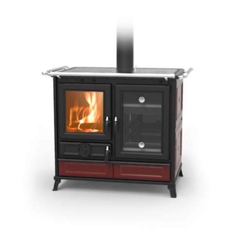 Cucina a legna costruita in acciaio e ghisa con grande superficie di scambio e lunghi percorsi obbligati dei fumi, dotata di uno speciale scambiatore in acciaio inox, camera di combustione in ghisa, comandi per la regolazione dell'aria primaria, secondaria e terziaria, maniglie antiscottatura in acciaio, scuoti griglia, starter, porta focolare in ghisa smaltata con vetro ceramico resistente a 750°, cornice superiore in ghisa smaltata, piano in ghisa levigata, doppia serie di cerchi in ghisa, corrimano frontale, dispositivo brevettato PANEPIZZA per gestire la temperatura dei forni, comando per la reolazione delle temperature dei forni , porta forno con 2 termometri, forno inferiore smaltato da 35 lt con base in pietra lavica, forno superiore smaltato da 14 lt con base in pietra lavica, cassettone portalegna - attrezzi, cassetto cenere estraibile, piedini in ghisa smaltata. Rivestimento esterno in pregiata maiolica e ghisa.