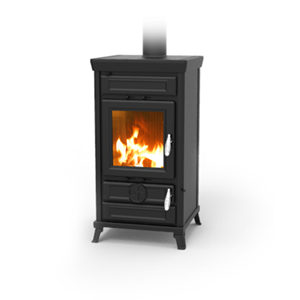 Stufa a legna costruita in acciaio e ghisa con grande superficie di scambio e lunghi percorsi obbligati dei fumi, dotata di uno speciale scambiatore in acciaio inox, camera di combustione in ghisa, comandi per la regolazione dell'aria primaria, secondaria e terziaria, maniglie antiscottatura in acciaio, scuoti griglia, porta in ghisa smaltata con vetro ceramico resistente a 750°, finitura superiore in ghisa smaltata, cassetto cenere estraibile. Rivestimento esterno in ghisa e fiachi in acciaio verniciato. Tecnologia Smoke by-pass, attivando il dispositivo si riduce drasticamente la fuoriuscita di fumo nell'ambiente ad ogni carica di legna.