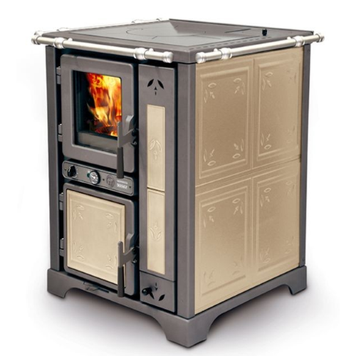 COMPONENTI: Termoprodotto ecologico a legna costruita in acciaio di grosso spessore. Il corpo caldaia può avere lo speciale trattamento di vetrificazione con garnzia 8 anni (optional). Due i rivestimenti in fine ceramica disponibili, con decorazioni a Fiori o nell'esclusiva versione Vintage; porte in ghisa e maniglie anti-scottatura in isoplast PA66. Vetro ceramico per la visione della fiamma, potenza al focolare massima 30.5 kW, potenza nominale massima 21.4 kW, di cui max. 19.1 kW resi all'acqua e 2.3 kW all'ambiente; dimensioni max. focolare 540x300x442 (HxLxP), aria primaria, aria secondaria regolata con termostato automatico. Questo dispositivo ottimizza il consumo di legna, offre maggiore autonomia e mantiene elveti i rendimenti. Dimensioni bocca fuoco mm 235x210 (HxL). Corrimano frontale in acciaio inox di serie, opzionali quelli laterali. Cornice superiore in acciaio verniciato grigio antracite, piano cottura in acciaio satinato (di serie) o vetrificato (optional), dispsitivo a manovella per il sollevamento della griglia focolare, attizzatoio, raschietto e guanto. Cassetto cenere estraibile, starter uscita fumi, termometro caldaia, termostato anticondensa, attacchi idraulici posteriori e laterali sx. da 1" femmina, scarico fumi superiore e posteriore D.150 mm, collarino, alzatina posteriore. Progetto costruttivo innovativo perchè consente di semplificare le operazioni di manutenzione straordinaria. Peso 215,2 kg.