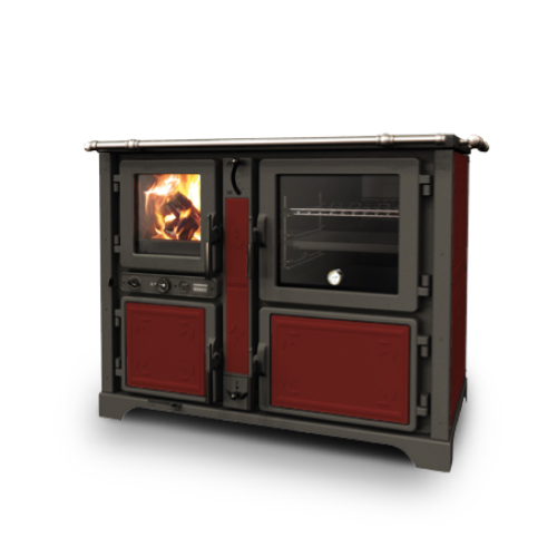 COMPONENTI: Termoprodotto ecologico a legna costruita in acciaio di grosso spessore. Il corpo caldaia può avere lo speciale trattamento di vetrificazione con garnzia 8 anni (optional). Due i rivestimenti in fine ceramica disponibili, con decorazioni a Fiori o nell'esclusiva versione Vintage; porte in ghisa e maniglie anti-scottatura in isoplast PA66. Vetro ceramico per la visione della fiamma, potenza al focolare massima 30.5 kW, potenza nominale massima 21.4 kW, di cui max. 19.1 kW resi all'acqua e 2.3 kW all'ambiente; dimensioni max. focolare 540x300x442 (HxLxP), aria primaria, aria secondaria regolata con termostato automatico. Questo dispositivo ottimizza il consumo di legna, offre maggiore autonomia e mantiene elveti i rendimenti. Dimensioni bocca fuoco mm 235x210 (HxL). Corrimano frontale in acciaio inox di serie, opzionali quelli laterali. Cornice superiore in acciaio verniciato grigio antracite, piano cottura in acciaio satinato (di serie) o vetrificato (optional), dispsitivo a manovella per il sollevamento della griglia focolare, attizzatoio, raschietto e guanto. Porta forno con termometro, forno in acciaio smaltato, groglia e leccarda su 3 livelli, dispositivo per regolare la temperatura del forno. Ampio cassetto scorrevole porta attrezzi, dimensioni forno 320x360x550 (HxLxP). Cassetto cenere estraibile, starter uscita fumi, termometro caldaia, termostato anticondensa, attacchi idraulici posteriori e laterali sx. da 1" femmina, scarico fumi superiore e posteriore D.150 mm, collarino, alzatina posteriore. Progetto costruttivo innovativo perchè consente di semplificare le operazioni di manutenzione straordinaria. Peso 299.5 kg.