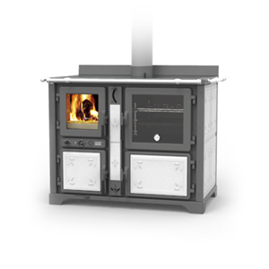COMPONENTI: Termoprodotto ecologico a legna costruita in acciaio di grosso spessore. Il corpo caldaia può avere lo speciale trattamento di vetrificazione con garnzia 8 anni (optional). Due i rivestimenti in fine ceramica disponibili, con decorazioni a Fiori o nell'esclusiva versione Vintage; porte in ghisa e maniglie anti-scottatura in isoplast PA66. Vetro ceramico per la visione della fiamma, potenza al focolare massima 30.5 kW, potenza nominale massima 21.4 kW, di cui max. 19.1 kW resi all'acqua e 2.3 kW all'ambiente; dimensioni max. focolare 540x300x442 (HxLxP), aria primaria, aria secondaria regolata con termostato automatico. Questo dispositivo ottimizza il consumo di legna, offre maggiore autonomia e mantiene elveti i rendimenti. Dimensioni bocca fuoco mm 235x210 (HxL). Corrimano frontale in acciaio inox di serie, opzionali quelli laterali. Cornice superiore in acciaio verniciato grigio antracite, piano cottura in acciaio satinato (di serie) o vetrificato (optional), dispsitivo a manovella per il sollevamento della griglia focolare, attizzatoio, raschietto e guanto. Porta forno con termometro, forno in acciaio smaltato, groglia e leccarda su 3 livelli, dispositivo per regolare la temperatura del forno. Ampio cassetto scorrevole porta attrezzi, dimensioni forno 320x360x550 (HxLxP). Cassetto cenere estraibile, starter uscita fumi, termometro caldaia, termostato anticondensa, attacchi idraulici posteriori e laterali sx. da 1" femmina, scarico fumi superiore e posteriore D.150 mm, collarino, alzatina posteriore. Progetto costruttivo innovativo perchè consente di semplificare le operazioni di manutenzione straordinaria. Peso 299.5 kg.