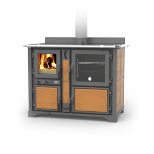COMPONENTI: Termoprodotto ecologico a legna costruita in acciaio di grosso spessore. Il corpo caldaia può avere lo speciale trattamento di vetrificazione con garnzia 8 anni (optional). Due i rivestimenti in fine ceramica disponibili, con decorazioni a Fiori o nell'esclusiva versione Vintage; porte in ghisa e maniglie anti-scottatura in isoplast PA66. Vetro ceramico per la visione della fiamma, potenza al focolare massima 30.5 kW, potenza nominale massima 21.4 kW, di cui max. 19.1 kW resi all'acqua e 2.3 kW all'ambiente; dimensioni max. focolare 540x300x442 (HxLxP), aria primaria, aria secondaria regolata con termostato automatico. Questo dispositivo ottimizza il consumo di legna, offre maggiore autonomia e mantiene elveti i rendimenti. Dimensioni bocca fuoco mm 235x210 (HxL). Corrimano frontale in acciaio inox di serie, opzionali quelli laterali. Cornice superiore in acciaio verniciato grigio antracite, piano cottura in acciaio satinato (di serie) o vetrificato (optional), dispsitivo a manovella per il sollevamento della griglia focolare, attizzatoio, raschietto e guanto. Porta forno con termometro, forno in acciaio smaltato, groglia e leccarda su 3 livelli, dispositivo per regolare la temperatura del forno. Ampio cassetto scorrevole porta attrezzi, dimensioni forno 320x360x550 (HxLxP). Cassetto cenere estraibile, starter uscita fumi, termometro caldaia, termostato anticondensa, attacchi idraulici posteriori e laterali sx. da 1" femmina, scarico fumi superiore e posteriore D.150 mm, collarino, alzatina posteriore. Progetto costruttivo innovativo perchè consente di semplificare le operazioni di manutenzione straordinaria. Peso 299.5 kg.