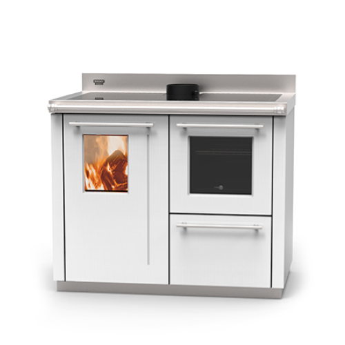 Bosky si rinnova e diventa ancora più bella e funzionale grazie alla configurazione READY TO START: pronta da installare perchè equipaggiata di serie con circolatore, valvola di sicurezza, valvola di sicurezza termica, valvola di sfiato, scambiatore di sicurezza e vaso d'espansione per l'istallazione a vaso chiuso. Sostituzione semplificata grazie alle medesime quote di attacchi idraulici e uscita fumi delle versioni precedenti. COMPONENTI: corpo caldaia in acciaio di grosso spessore può avere lo speciale trattamento di vetrificazione con garanzia 8 anni (optional). Rivestimento smaltato di vari colori con porta focolare in ghisa e maniglia anti-scottatura, vetro ceramico per la visione della fiamma, potenza al foclare massima 21.4 kW, di cui max. 19.1 kW resi all'acqua e 2.3 kW all'ambiente; dimensione max. focolare 540x290x442 (HxLxP), aria primaria, aria secondaria regolata con termostato automatico. Questo dispositivo ottimizza il consumo di legna, offre maggiore autonomia e mantiene elevati i rendimenti. Dimensioni bocca fuoco mm282x224 (HxL). Porta forno a doppio vetro con termometro, forno in acciaio smaltato completo di griglia e leccarda regolabile su 3 livelli HxLxP 320x360x550, dispositivo per regolare la temperatura del forno su 5 livelli. Cassetto scorrevole porta attrezzi, completo di maniglia in acciaio, attizzatoio, raschietto e guanto. Maniglie in acciaio, comodo scuotimento griglia, leva per il sollevamento della griglia focolare su 3 altezze, cassetto cenere estraibile, starter uscita fumi, termometro e manometro caldaia, termostato anticondensa, attacchi idraulici posteriori e laterali sx. da 1" 1/4 femmina, scarico fumi superiore o posteriore D.150 mm, alzatina posteriore in acciaio inox, piano cottura in acciaio satinato o in vetro ceramico CERAN (optional). Progetto costruttivo innovativo perchè consente di semplificare le operazioni di manutenzione straordinaria. Peso 310 kg.