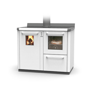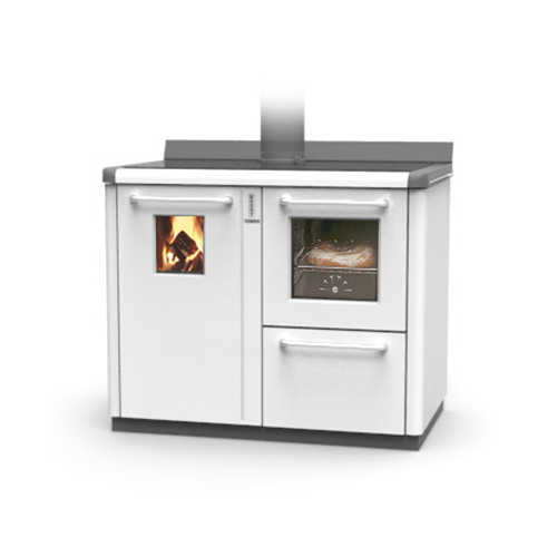 COMPONENTI: Termoprodotto ecologico a legna costruita in acciaio di grosso spessore. Il corpo caldaia può avere lo speciale trattamento di vetrificazione con garanzia 8 anni (optional). Rivestimento smaltato di vari colori con porta focolare in ghisa in ceramica con finiture in rilievo a fiori, potenza al focolare 30.5 kW, potenza nominale massima kW 21.4, di cui 19.1 kW resi all'acqua e 2.3 kW all'ambiente; dimensione max. focolare 540x300x442 (HxLxP), aria primaria, aria secondaria regolata con termostato automatico. Questo sistema ottimizza il consumo di legna, offre maggiore autonomia e mantiene elevati rendimenti. Dimensione bocca fuoco mm 235x210 (HxL). Cornice superiore in ghisa con stendini a scomparsa integrati. Porta forno a doppio vetro con termometro, forno in acciaio smaltato, griglia leccarda regolabile su 3 livelli, luce forno, dispositivo per regolare la temperatura del forno su 5 livelli. Ampio cassetto scorrevole porta attrezzi completo maniglia in acciaio satinato, attizzatoio, raschietto e guanto. Dimensioni forno 320x360x550 (HxLxP). Maniglie in acciaio satinato, comodo scuotimento griglia, leva per il sollevamento della griglia su 3 altezze, cassetto cenere estraibile, starter uscita fumi, termostato caldaia, termostato anticondensa, interruttore luce forno, attacchi idraulici posteriori e laterali sx. da 1" 1/4 femmina, scarico fumi superiore D.150 mm, alzatina posteriore, piano cottura in acciaio satinato, piano vetrificato (optional). Progetto costruttivo innovatico perchè consente di semplifcare le operazioni di manutenzione straordinaria. Peso 305,8 kg.