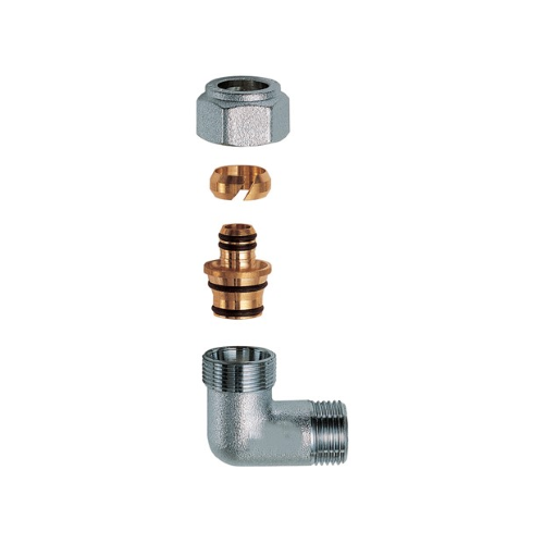 Raccordo a gomito maschio a stringere per tubo multistrato con adattatore conico estraibile.