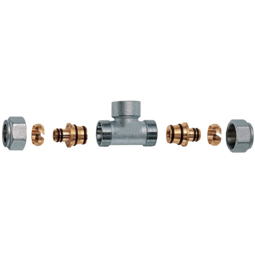 Raccordo a T femmina a stringere per tubo multistrato con adattatori conici estraibili.