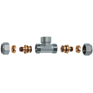 Raccordo a T femmina a stringere per tubo multistrato con adattatori conici estraibili.